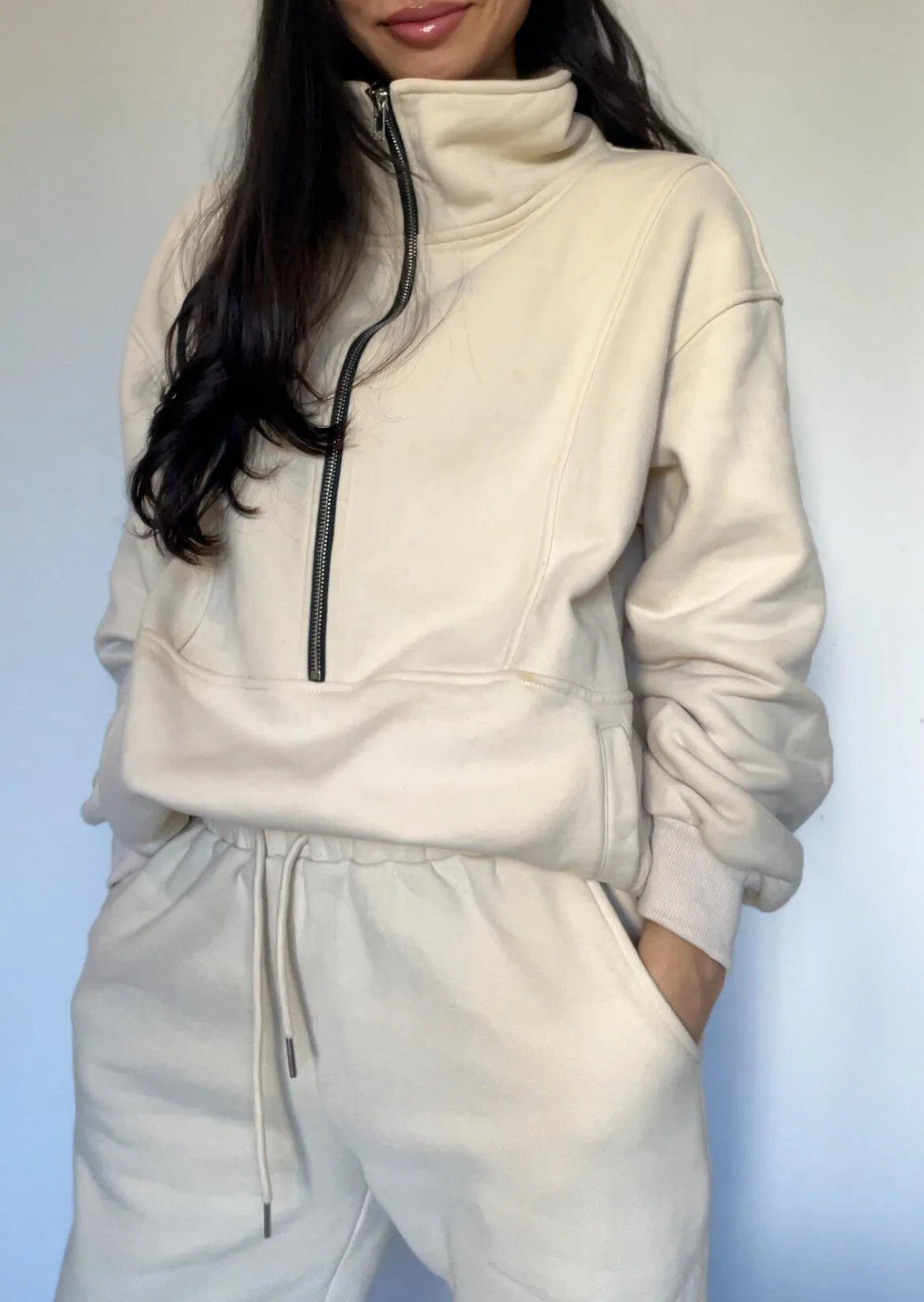 The extra-deep half-zip front allows easy access to either breast, making nursing or pumping quick and discreet. Unlike standard half-zips, this one is intentionally designed for real breastfeeding needs. Thoughtful details like functional pockets and a relaxed, flattering fit make this set one you’ll reach for on repeat.